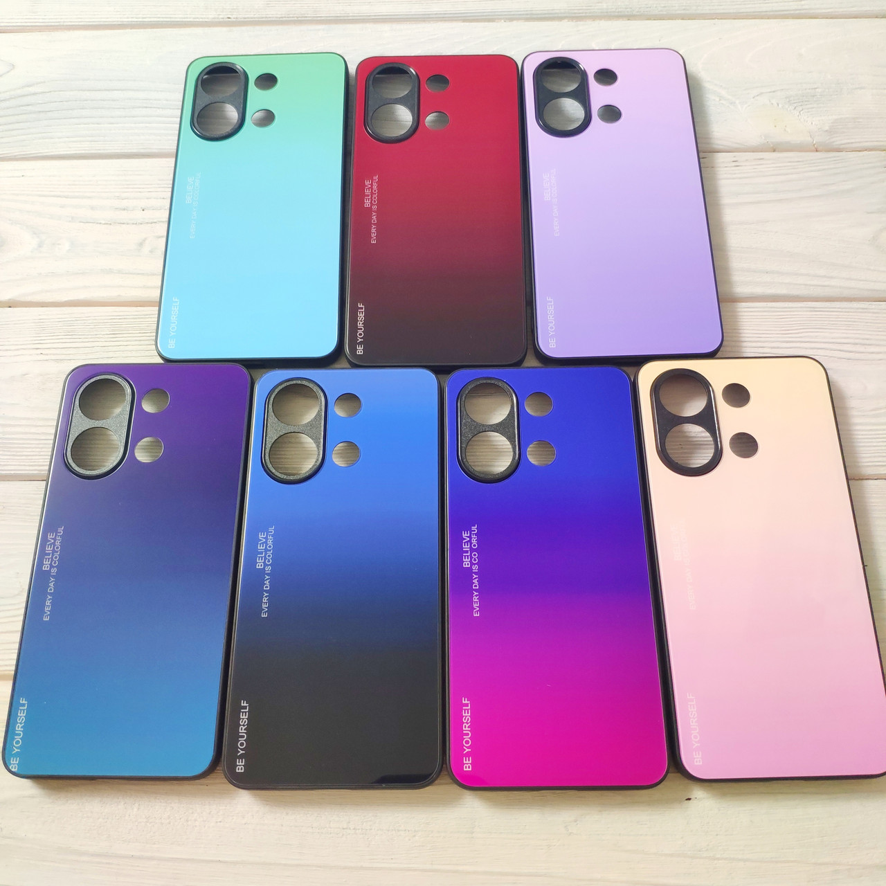 Задня панель виготовлена із загартованого скла з градієнтом. Матеріал бічної частини – гума. Скляне покриття не дряпається. Кришка міцна, стійка до сколів, витримує сильні удари. Гумовий бампер захищає кути та бічні рамки мобільного пристрою, поглинає удари. Навколо екрана та лінзи задньої камери краю піднесені для захисту від утворення подряпин.